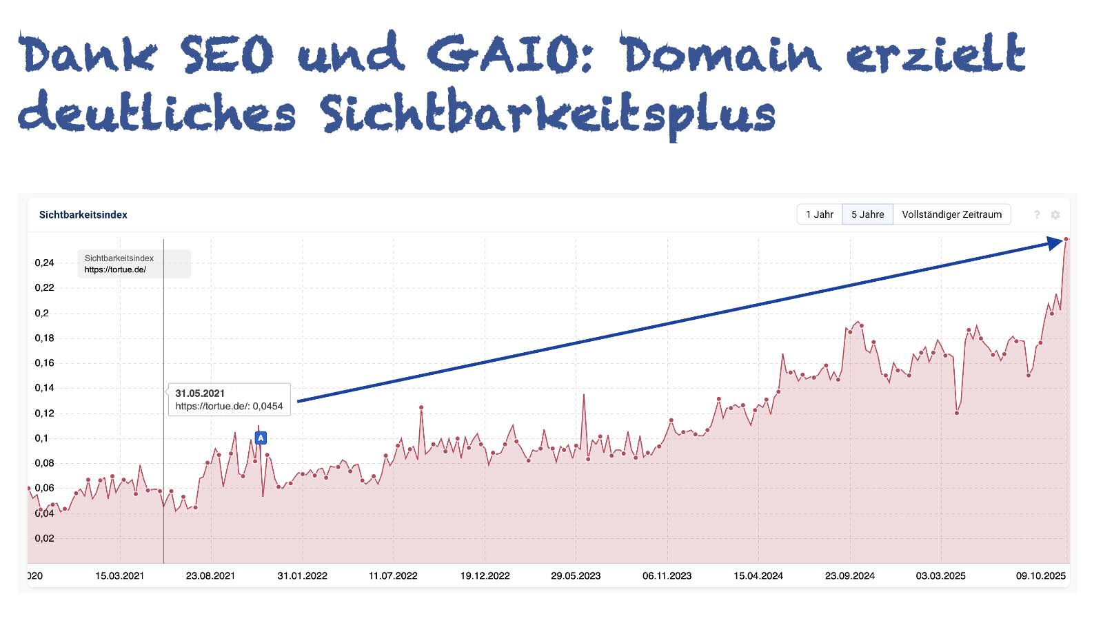 Wir begleiten das Boutique-Hotel TORTUE gemeinsam mit Mika Frahm (Head of Marketing) seit mehreren Jahren bei der SEO- und KI-Optimierung – mit starken Ergebnissen: